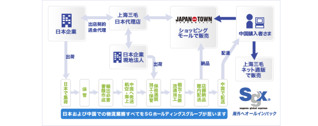 目前,中国的网上购物市场正急剧地扩大,与此同时,质量·服务·配送等方面也产生了各种各样的问题点。另外,从正在讨论如何扩大在中国的销路的日本供应商各公司反映,仅通过网上购物在中国市场难以扩大销路,另一方面,在设立实体店铺销售的当地法人代表时也遇到了很多障碍。为了解决这些问题,上海三毛企业(集团)股份有限公司(中国上海A股上市公司)携手上海市宝山区内的上海市人民政府以及宝山区人民政府,共同推动的中国首次国际邮购产业园区的开发项目。该项目,是为了解决当前增长显著的中国市场的瓶颈问题,以确保[品质保证][放心・安全][服务]为目的,以日本企业为首,使外资企业能放心地在中国进行商品销售和业务拓展而提供的平台。对于佐川全球物流有限公司中的该项目其中一环「JAPAN TOWN」的物流业务,拥有在日本国内的佐川宅急送有限公司(以下简称[佐川宅急送])的网络以及在上海当地的分公司开展送货上门业务的上海大众佐川宅急送物流有限公司(以下简称[上海大众佐川])和在上海・外高桥保税区内开展物流中心的佐川喜乐客物流(上海)有限公司(以下简称[佐川喜乐客思上海])等SG控股集团的综合力,支援着日本供应商扩大在中国的销路。