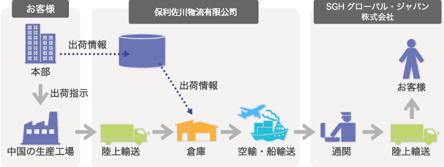 海外拠点にてピッキング等を行い日本国内到着後、全国のお客様へダイレクトに出荷が可能