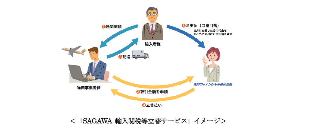 2017年8月7日SG HOLDINGS GROUP 佐川FINANCIAL 股份有限公司(总公司:东京,总经理:中原滋)开始提供「SAGAWA进口关税垫付服务」。SG向通关代理商垫付关税等费用,让客服日后和其他费用一起支付。
